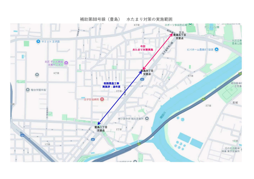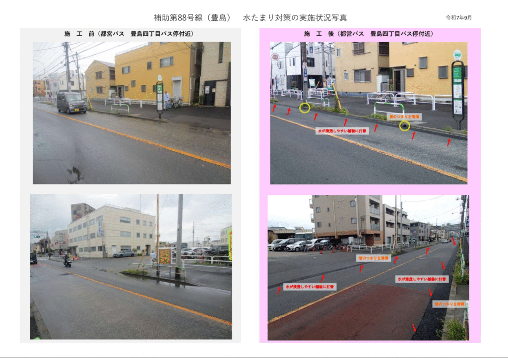 ・豊島二丁目交差点から豊島四丁目交差点にかけては、雨水を取り込む下水道管の敷設や街路築造工事を終えており、状況が改善されている