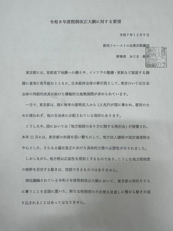 令和7年12月9日、都民ファーストの会東京都議団の幹事長・おじま紘平都議が、政府・与党に対して「令和8年度税制改正大綱に対する要望」を提出しました。