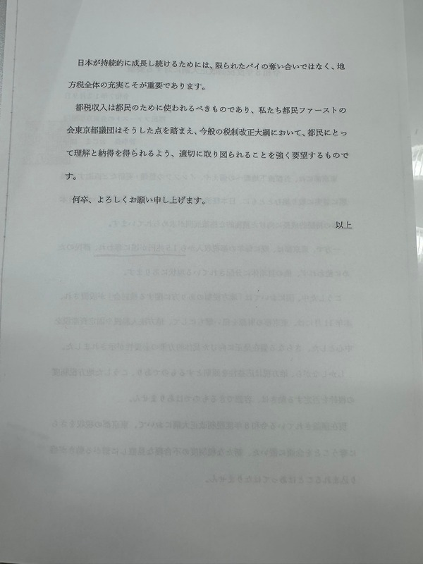 近くまとめられる令和8年度税制改正大綱において、都民へ理解と納得が得られる内容となるよう、引き続き訴えてまいります。