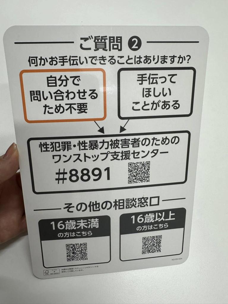 声を出さずにカードを指さすだけで意思表示ができる仕組みで、性犯罪・性暴力被害者のためのワンストップ支援センター(#8891)の案内や年齢別相談窓口のQRコードも掲載。