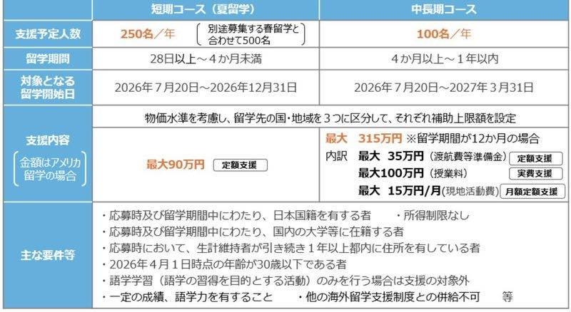 都の答弁では、アメリカへの中長期留学の場合、渡航費・授業料・現地活動費を合わせ最大315万円の支援が受けられ、