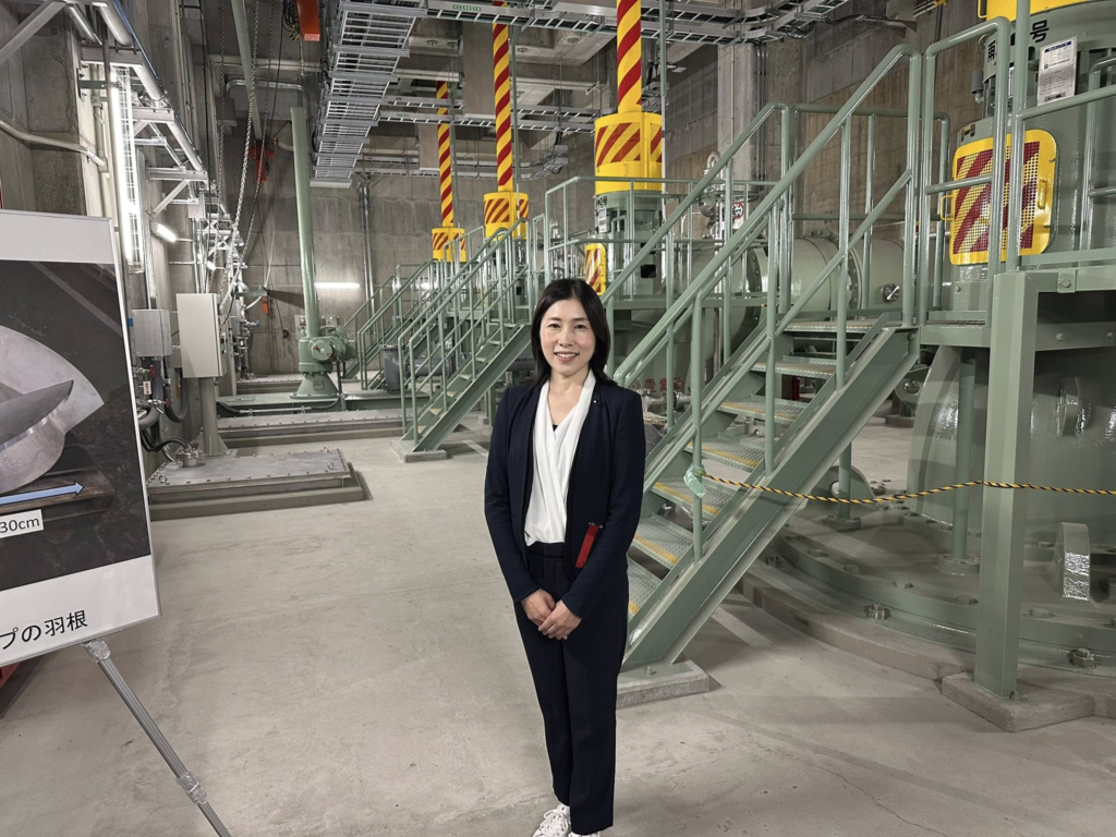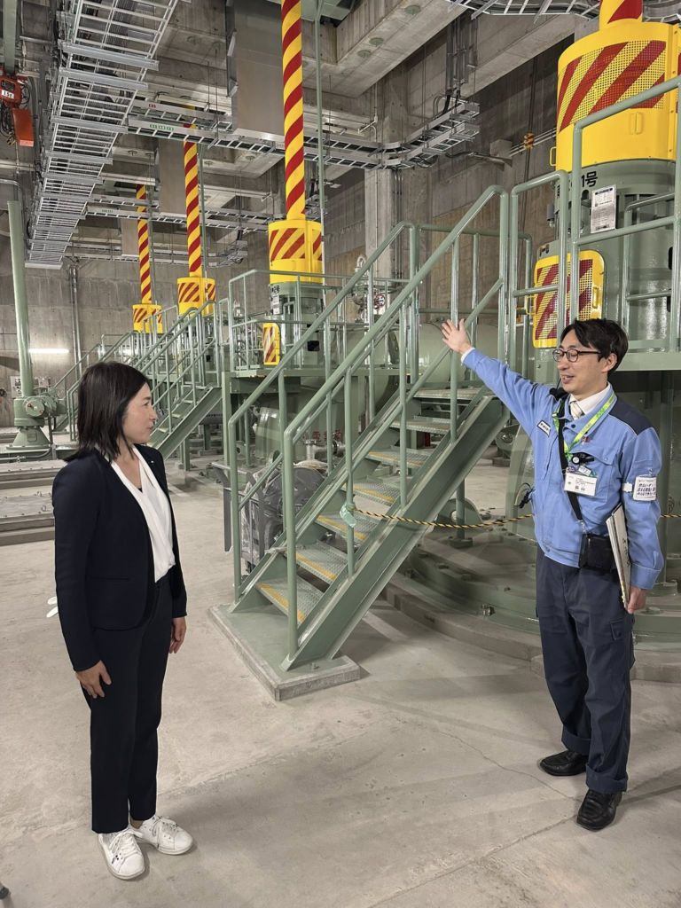 流入ゲート→沈砂池室→ポンプ室→電動機室→発電機室→屋上と、地下約35mの深さにある設備まで間近で見学。