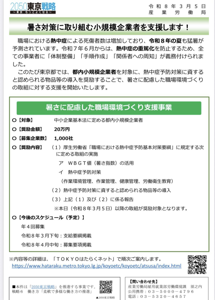 そうした積み重ねの中で、東京都がこのたび、働く現場への具体的な支援策・暑さに配慮した職場環境づくり支援事業を打ち出しました。