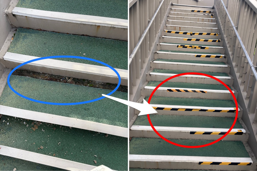 • 階段蹴上げ部にトラテープによる応急対処を実施