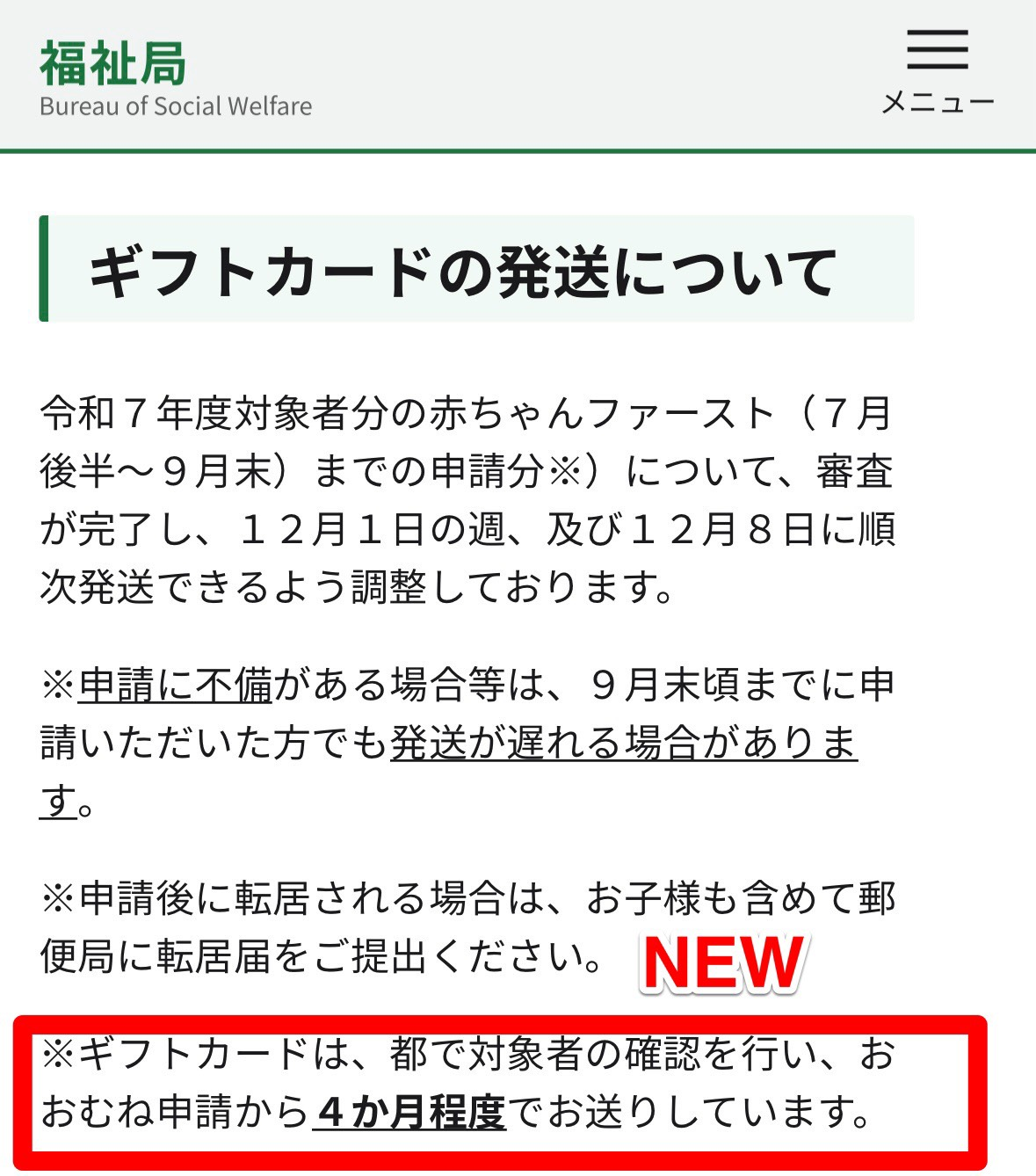 東京都「赤ちゃんファースト事業」ギフトカード到着見通しの情報発信を改善